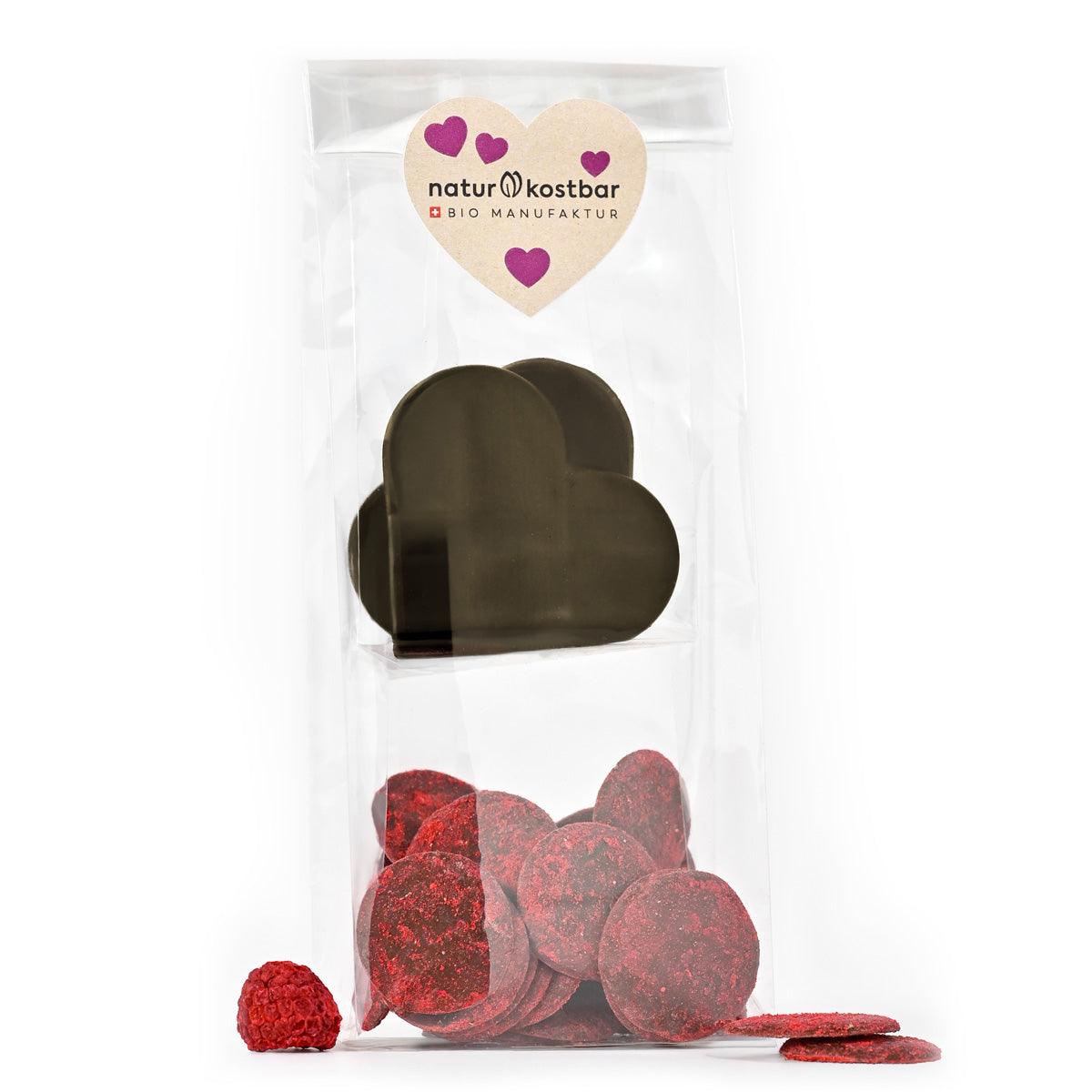 Den seltenen wild gewachsenen Kakao aus dem Dschungel Boliviens mahlen wir in unserer Berner Bio-Manufaktur auf der traditionellen Steinmühle und verarbeiten ihn zu 73 %-Schokolade. Daraus entstehen die zwei hübschen Schoggi-Herzen. Mit viel Liebe legen wir diese von Hand in ein Säckli, zusammen mit Schokodrops aus 49 % Peru-Schokolade und rosa Schimmer aus gefriergetrockneten Himbeeren.